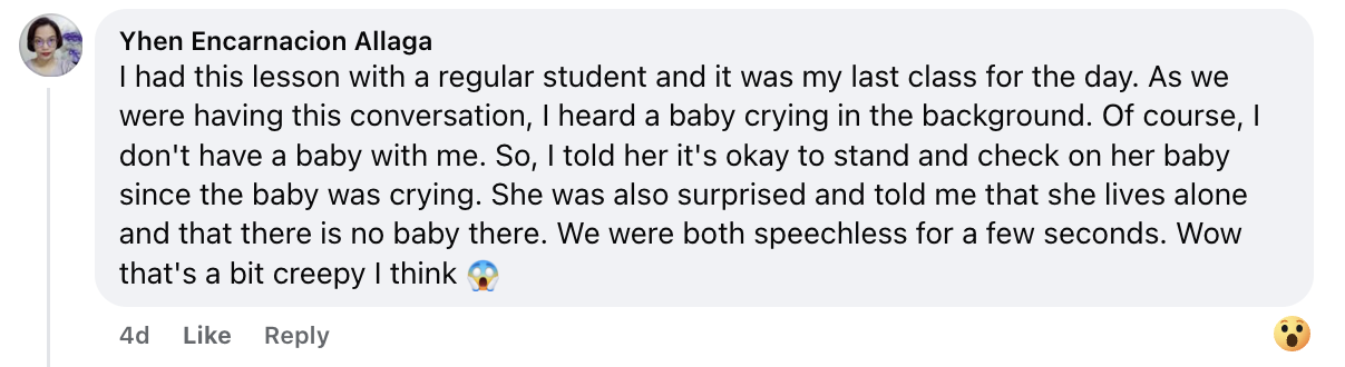 Some tutors recalled creepy encounters that happened right in class. Imagine calmly discussing grammar when your student suddenly asks, “Tutor, who’s that behind you?” Others reported experiencing flickering lights, whispers in their headsets, or cameras glitching at the worst possible moment. A few even joked that multitasking during Halloween means managing both students and spirits! It turns out that ESL teaching can be a real test of composure when the paranormal decides to join the lesson.