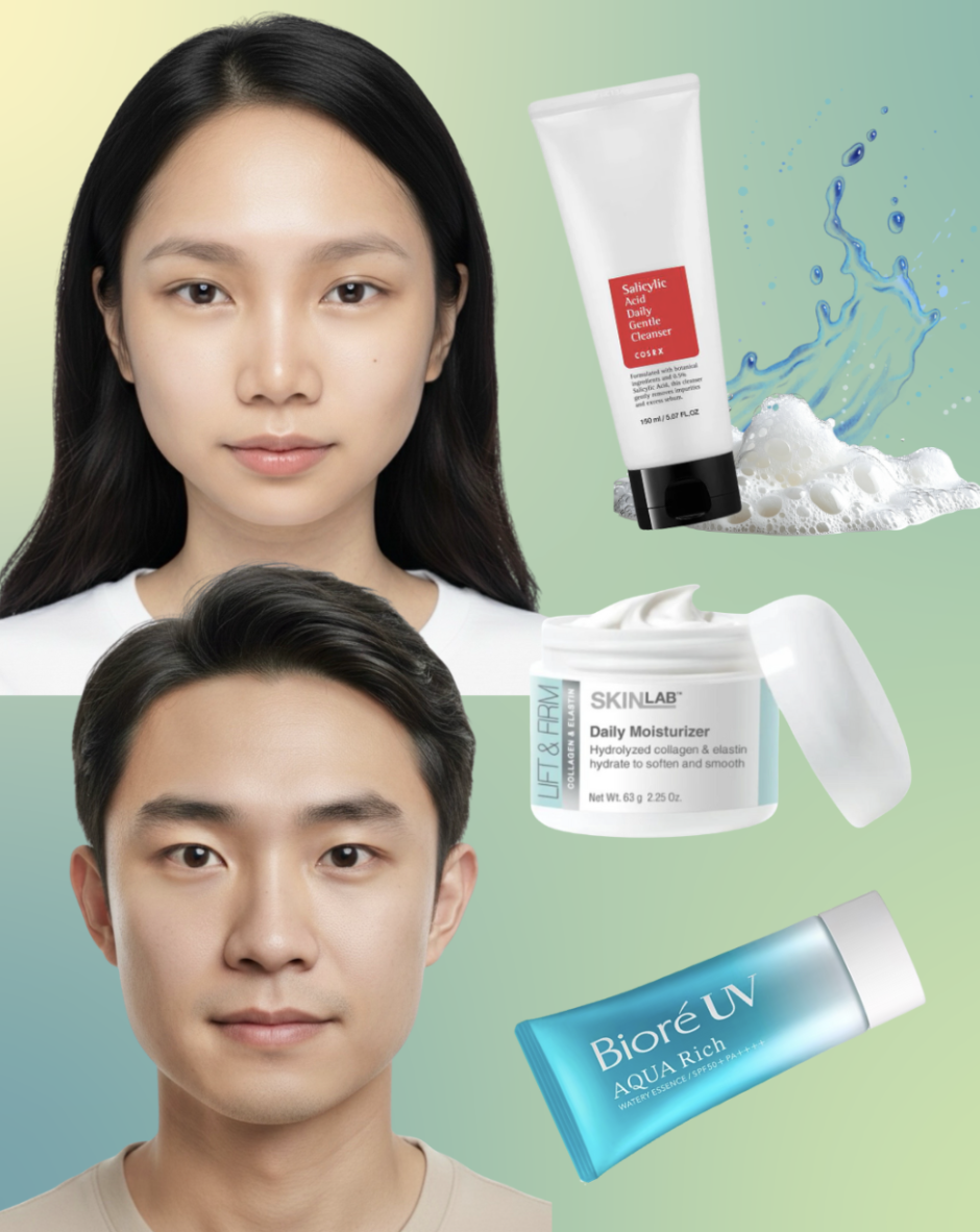 Products: Gentle cleanser, lightweight moisturizer, broad-spectrum sunscreen