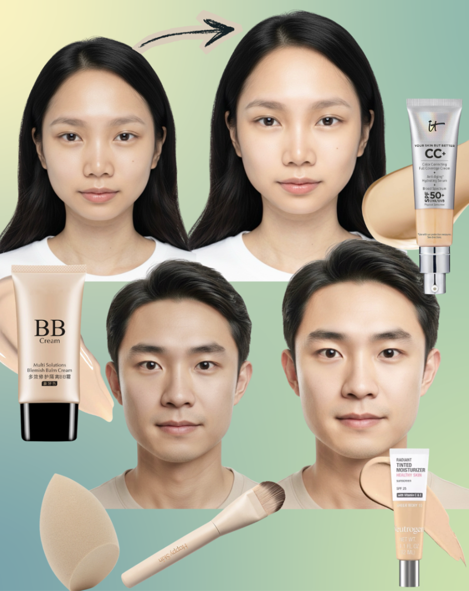 Products: BB cream (SPF + hydration), CC cream (tone correction), tinted moisturizer