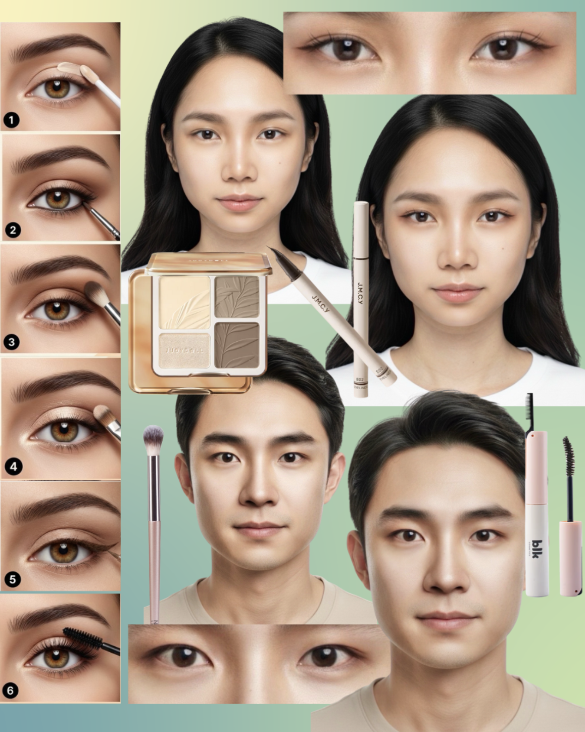 How to apply: Neutral matte lid → Deeper crease shade → Line close to lash line → Curl lashes + Mascara/cluster lashes